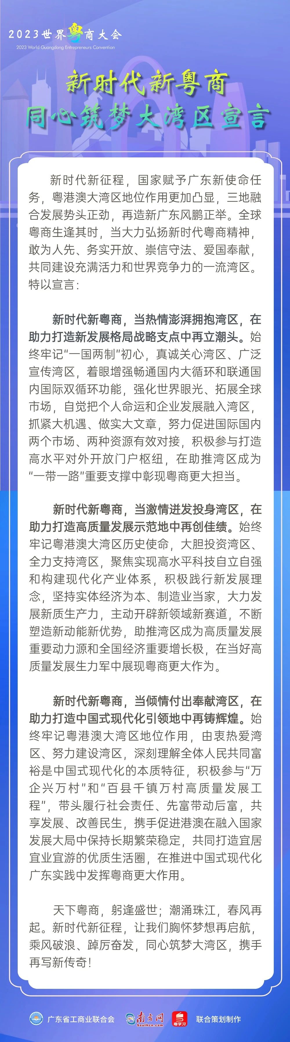 9月22日,在以“全球粤商 世界湾区 共享未来” 为主题的2023世界粤商大会上,广东省工商联主席陈志列现场宣读《新时代新粤商同心筑梦大湾区宣言》,号召全球粤商大力弘扬新时代粤商精神,敢为人先、务实开放、崇信守法、爱国奉献,共同建设充满活力和世界竞争力的一流湾区。
