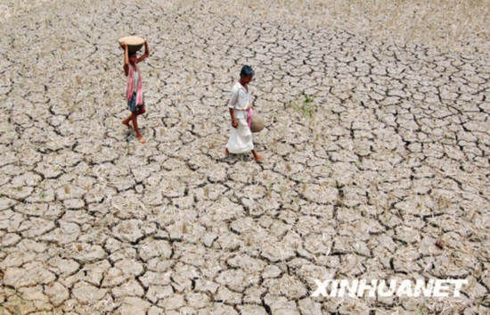 资料图片:2009年5月14日,在印度东部的阿加尔塔拉,一对父子走在干裂的田地上。持续数月的干旱和当地落后的灌溉系统使许多农作物旱死。新华社发(牛晓雷编辑)