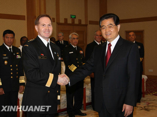 4月23日上午,国家主席、中央军委主席胡锦涛在青岛会见应邀前来参加中国人民解放军海军成立60周年庆典活动的29国海军代表团团长,代表中国政府和军队向参加庆典活动的各国海军官兵表示热烈欢迎。 新华社记者王建民摄