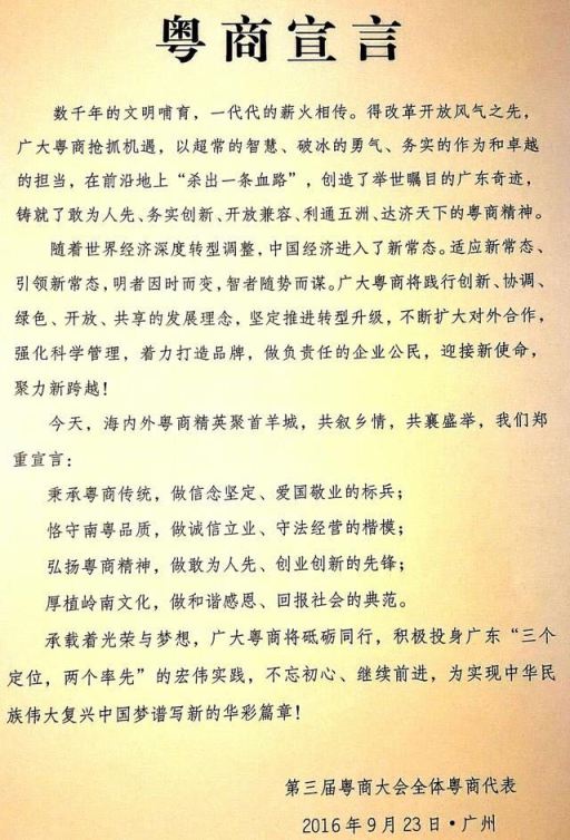 全国政协副主席、全国工商联主席王钦敏强调,广大粤商要深入贯彻落实习近平总书记系列重要讲话精神,深入践行五大发展理念,要积极践行社会主义核心价值观,要积极参与“一带一路”建设,要坚持守法诚信经营,勇于承担社会责任。全国工商联将一如既往,与广大海内外粤商一道,共同助力广东实现新发展。