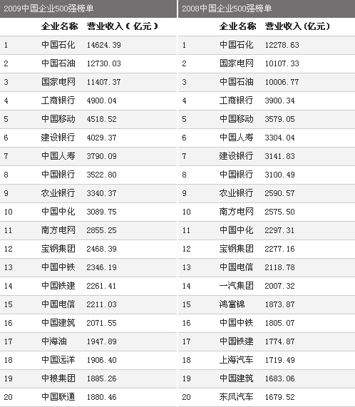 2009年、2008年中国企业500强前20名对比: