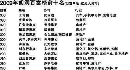 昨天在北京揭晓的2009胡润百富榜上,新晋首富是“汽车狂人”、比亚迪董事局主席兼总裁王传福,榜单上他的资产列为350亿元人民币,相比去年榜单首富黄光裕继续缩水近20%。黄光裕以财富230亿元位列第17位。