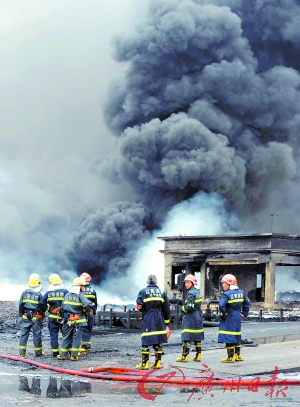 “昨晚爆炸起火时我正在操场上散步,听到巨响后回头一看,不远处的输油管线瞬间冒起浓烟,由白到黑,逐渐浓烈,火势也大起来了。我们马上拨打报警电话,3分钟内消防车就赶到现场开始救火。爆炸发生10分钟后,爆炸地点升腾起几米高的火柱,火光几乎映亮了整个30万吨原油码头。16日深夜,这里油烟遮挡了大半边天,到17日上午油烟的浓度开始下降。”陈志刚说。