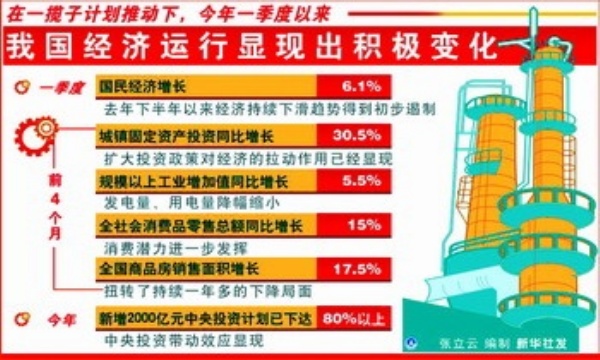“在应对金融危机方面,我国政府见事早、判断准、行动快,应对危机政策措施出台的速度、频率和力度,世所罕见。从中国经济运行出现的积极迹象看,形势比预料的好。事实证明,中央为应对经济困难出台的一揽子计划是及时、正确和有效的。”国家统计局总经济师姚景源说,“但要清醒地认识到世界经济形势依然严峻,中国经济仍处于困难时期。要落实好中央各项措施,把好的苗头稳定住。”