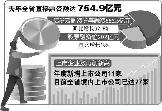 记者近日从省政府金融办获悉,去年,全省抢抓机遇,推进多方式、多渠道直接融资,带动了社会融资总量的扩大,直接融资额达754.9亿元,同比增长50.9%,高于全国平均增长水平21个百分点。其中,股票融资逾202亿元,同比增长18%;债券及融资券等融资552.5亿元,同比增长67.9%。年度直接融资额在全国的位次由2010年末的第11位升至第9位,在中部的位次由2010年末的第3位上升至第1位。