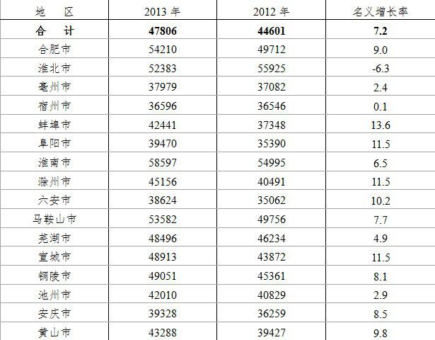 分地区看,2013年平均工资排前四位的是淮南、合肥、马鞍山、淮北,分别为58597元、54210元、53582元和52383元;排后四位的是宿州、亳州、六安、安庆,分别为36596元、37979元、38624元和39328元。同比名义增长率排前四位的是蚌埠、阜阳、滁州、宣城,分别增长13.6%、11.5%、11.5%和11.5%;排后四位的是淮北、宿州、亳州、池州,其中淮北下降6.3%,其他三市分别增长0.1%、2.4%和2.9%。