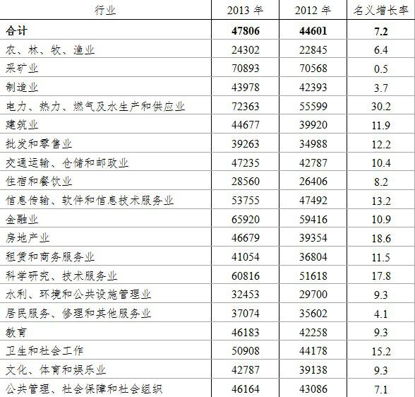 表2:2013年城镇非私营单位分行业就业人员年平均工资