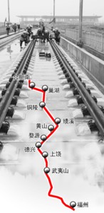 继京沪高铁、合蚌高铁后,合福铁路是我省第三条无砟轨道的高铁。该项目自合肥引出,经巢湖、铜陵、芜湖、宣城、黄山五市,过江西婺源、上饶,福建武夷山、南平,至福州站。新建线路全长806公里,其中安徽段全长343公里。