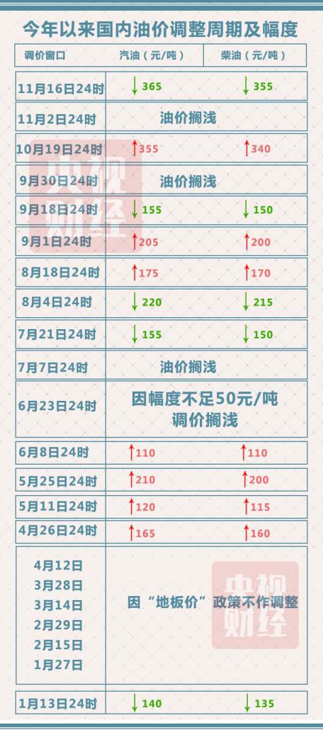 (央视财经 记者平凡 唐筱岚)11月16日24时,我国国内成品油调价窗口将开启,由于国际市场原油价格震荡下降,国内油价也迎来年内第5次下调,也是年内最大降幅:汽油每吨下调365元,柴油每吨下调355元。按一般家用汽车油箱50L容量估测,加满一箱92号汽油将少花14块5毛钱。