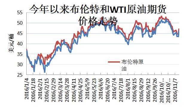 在连续多日下调后,近日有消息称欧佩克秘书长将在会议前到访主要成员国就限产协议细节进行讨论,市场对达成该协议的预期提升,油价急升。15日,布伦特、WTI原油期货价格每桶分别升至46.95美元、45.81美元,比前一交易日日分别上涨5.67%、5.75%。